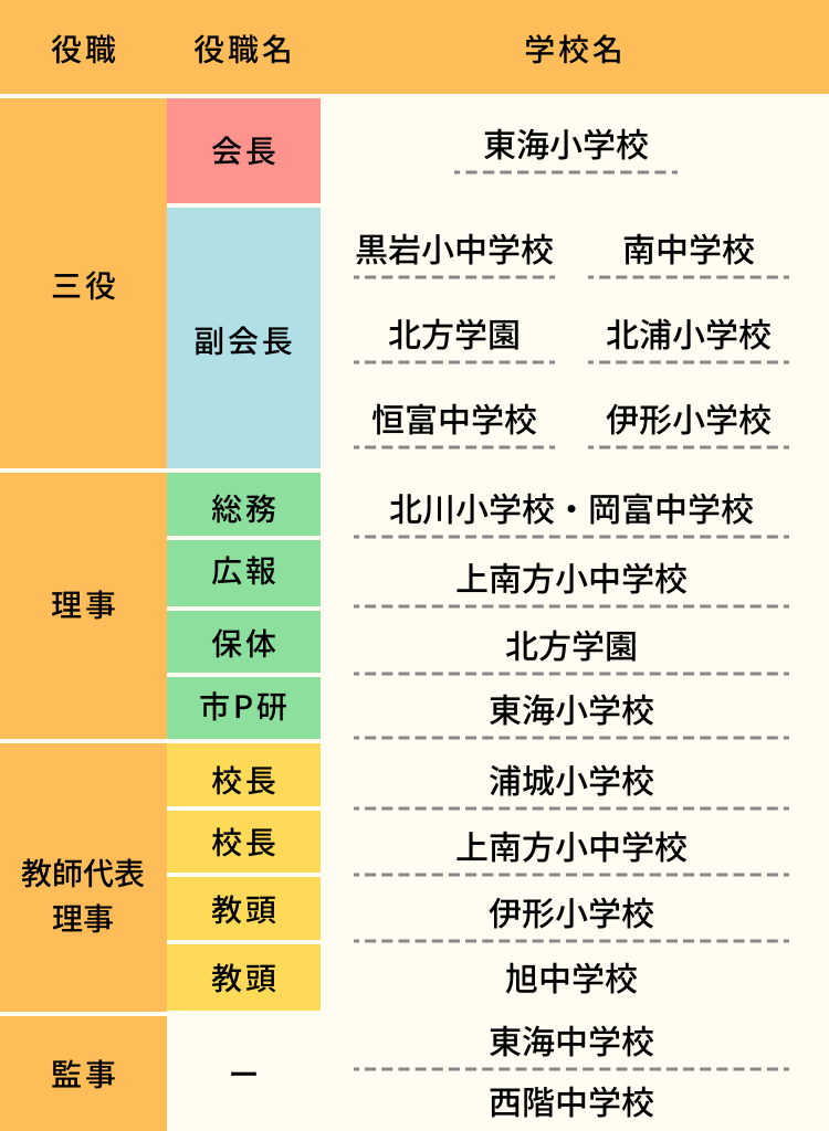 協議会の役員、単位PTAの会長、副会長、校長および教頭で構成し、各単位PTAの情報交換や協議会の事業運営に関して必要とする事項について協議します。
